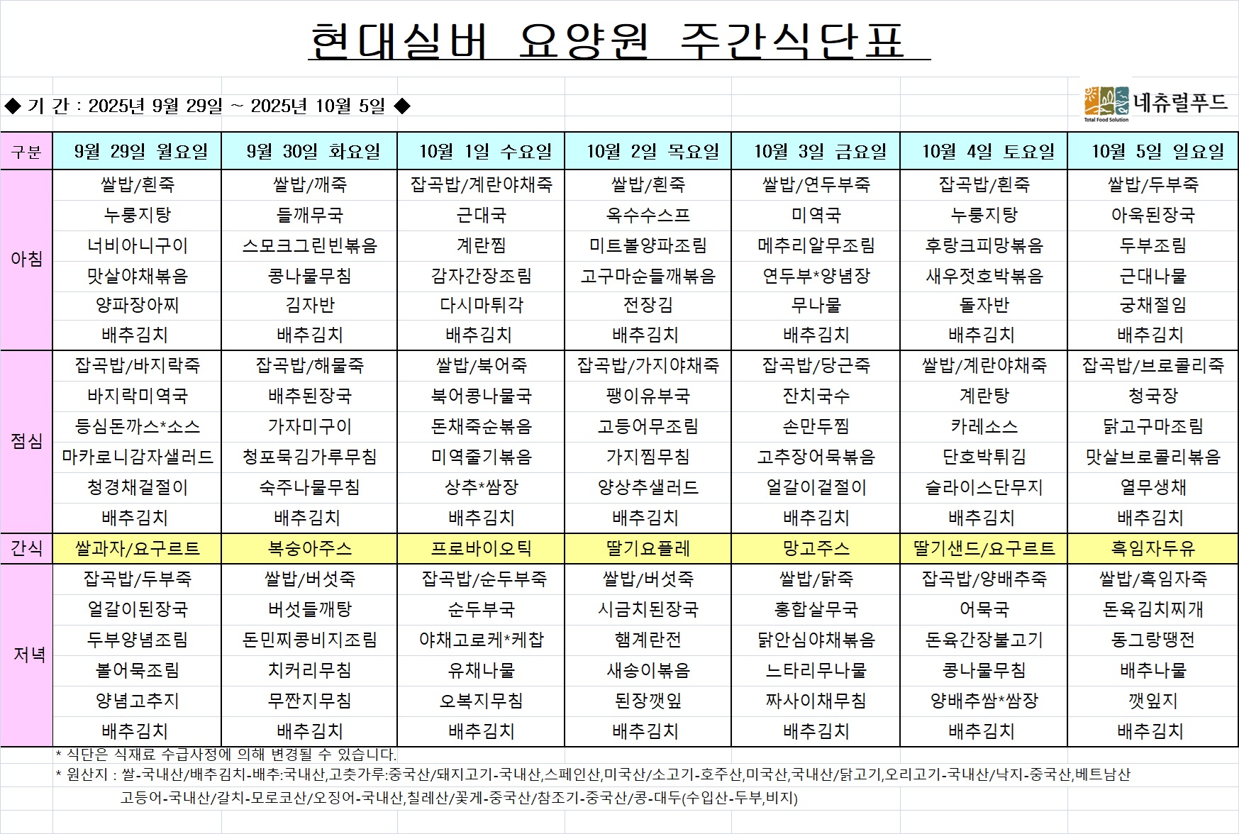 9월 29일 주간식단표