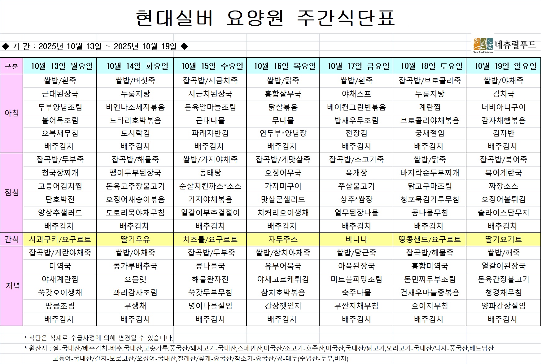 10월13일주 주간식단표 > 공지사항