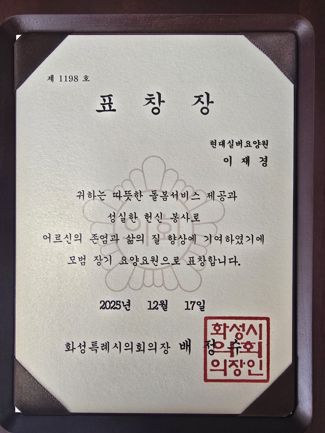 오랜 기간 어르신 돌봄 현장에서 보여주신 헌신과 전문성을 인정받아