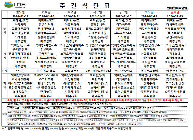 26년 1월 19일주 주간식단표입니다 ~